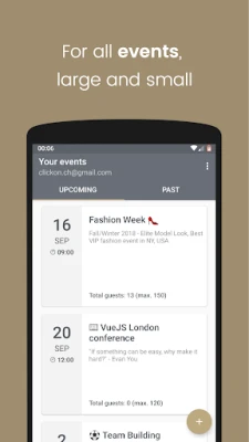 Eventor offers a free version for small events (up to 30 guests). All events can be created on our web portal https://eventor.app