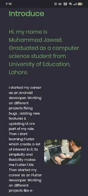 Hi, I am Muhammad Jawad working as a Software engineer. Here is my portfolio that shows all my work and expertise. This app is built in a flutter.