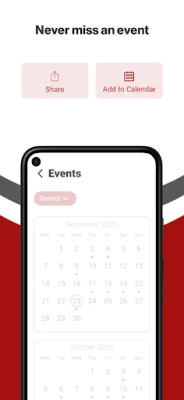 NEVER MISS AN EVENT The event section shows a list of events throughout the district. Users can add an event to their calendar to share the event with friends and family with one tap.