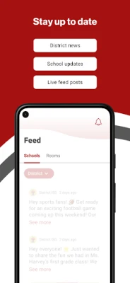 DISTRICT UPDATES In the Live Feed is where you'll find updates from the administration about what's going on in the district right now. Whether that's celebrating a student's success, or reminding you about an upcoming deadline.